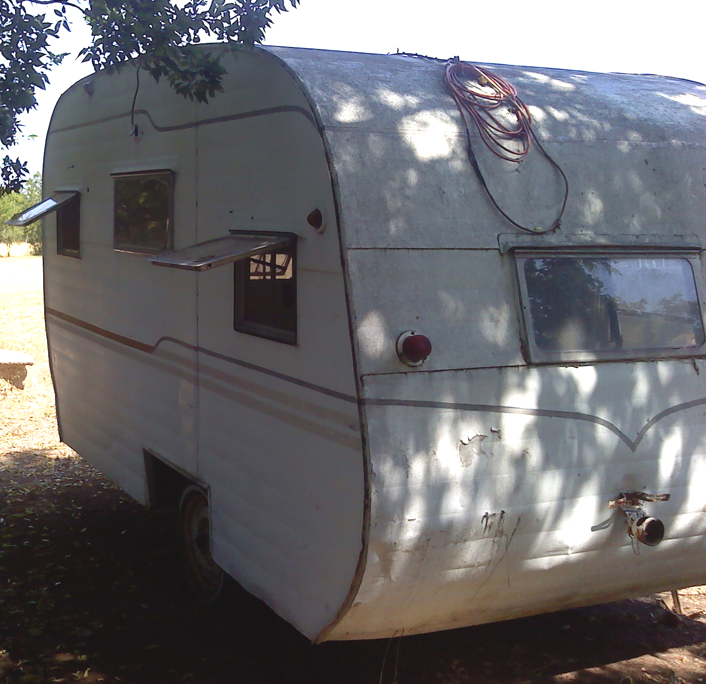 About 1952 -- 1958 year vintage camper Shasta Pony Express vintage camper. Research done recently indentifies this as a model that was offered without an interior, but as a "Do It Yourself Interior," versus the "Shasta Westerner" with an interior -- thereis an indication that Shasta purchased the company afterwards and sold them as an Shasta Airflyte with silver wings extending outward from the top rear corners. Overall exterior condition is in tact for an old camper. There is no title; it can still be registered without any problem. I will provide a Bill of Sale, with my contact information; this is sufficient to register it for a license plate. Lampasas County License Registration Office provided me a temporay moving permit for five dollars -- shouldn't be a problem obtaining one to move it to your location, as it is already on record.