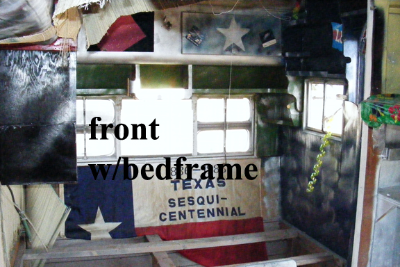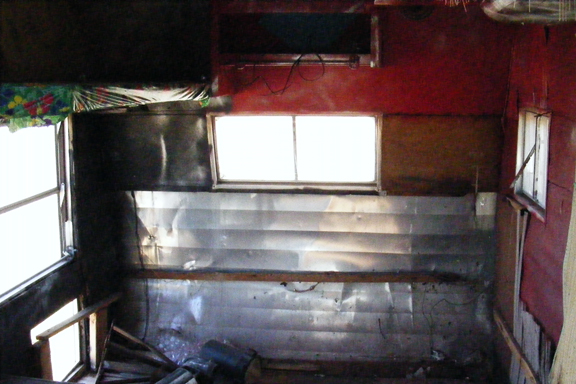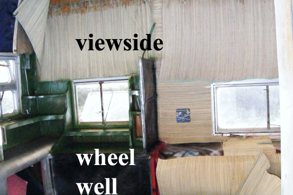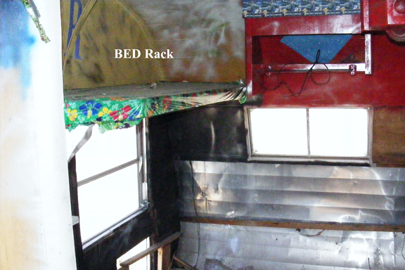 The inside is somewhat bare, some exceptions; there are no damaged interior siding, but just stripped. There are no appliances and the internal and external wiring are questionable. There are shelves, bins with working doors, and a bed rack still in tact. The large square hole in the side is for a small airconditioner. There are two propane bottle racks mounted on the front frame close to the hitch.